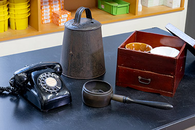 昔の道具(ひのし、がんどう、箱膳、黒電話)を実際に手に取り触ってみながら道具の使い方を調べることを通して先人の知恵を学んでいきます。